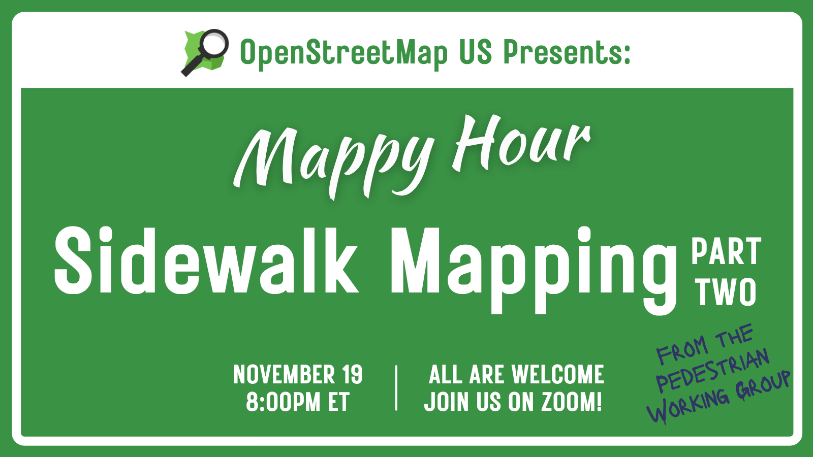 Back by popular demand, the OSM US Pedestrian Working Group will be leading another sidewalk-focused Mappy Hour on November 19th, 2025 at 8:00pm EST! Join us for a continuation of the discussions and mapping efforts from the first Mappy Hour in July, with dedicated space for beginner mappers. See you there!