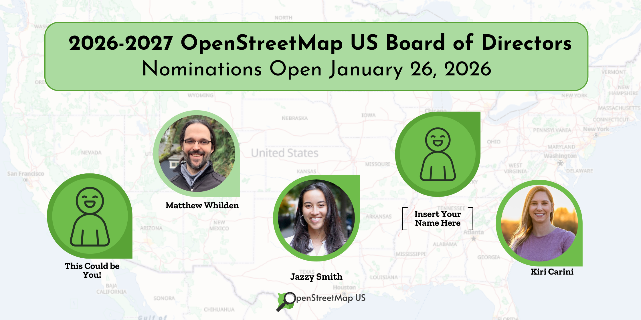 It’s election season at OpenStreetMap US! We are seeking two mapping enthusiasts to fill the open seats. Nominations for the OpenStreetMap US Board of Directors will open on Monday, January 26, 2026. We hope you will consider running. As a member of the OpenStreetMap US board, you can help shape the strategy and future of OpenStreetMap US at an exciting time of growth for the organization. The benefits and responsibilities of the board include: